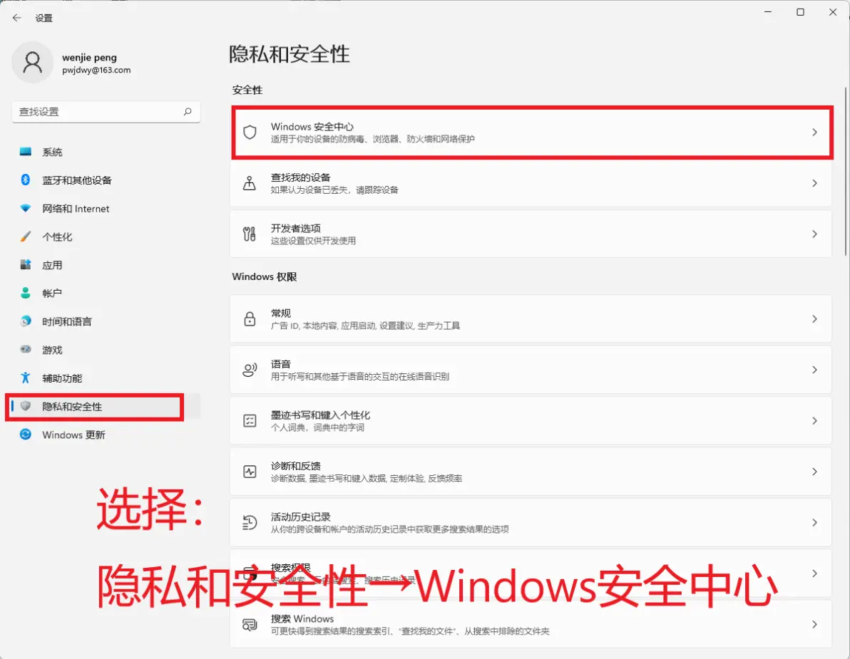 3.选择“隐私和安全性”→点击:Windows安全中心